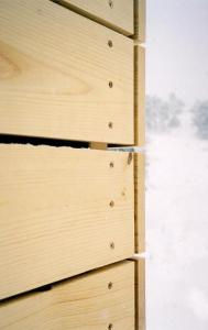 Corner detail of pine rain screen cladding.
