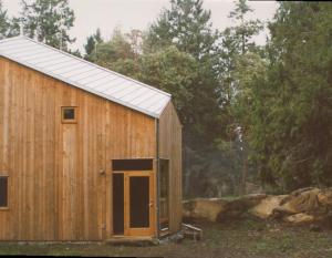 Guest bedroom door and small outdoor space defined by rock outcrop, forest and house.
